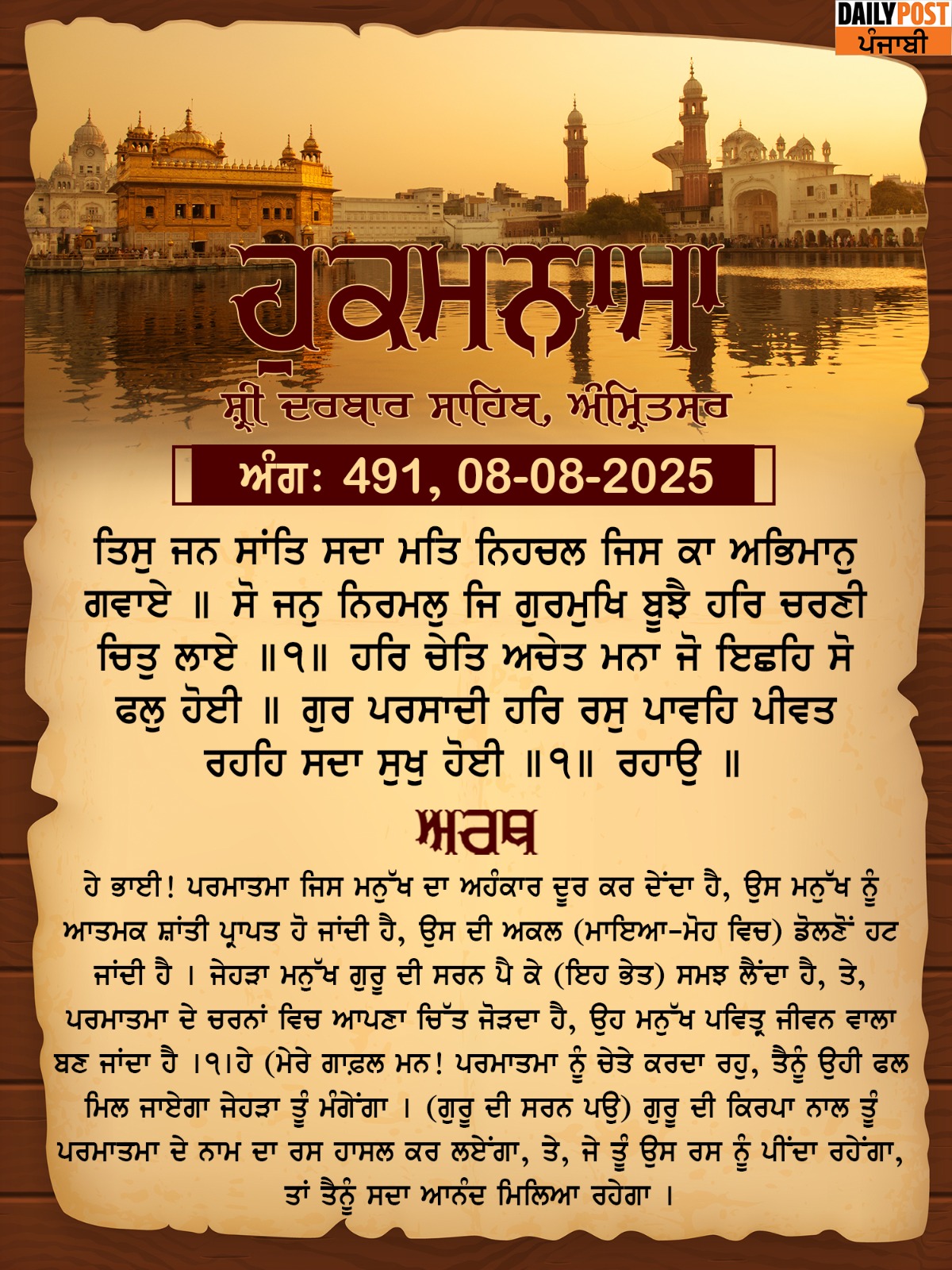 ਸ੍ਰੀ ਦਰਬਾਰ ਸਾਹਿਬ ਤੋਂ ਅੱਜ ਦਾ ਹੁਕਮਨਾਮਾ 8-8-2025
