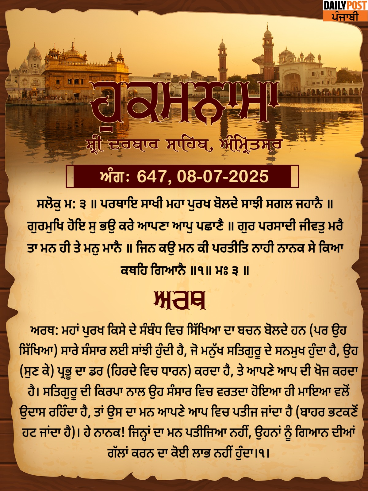 ਸ੍ਰੀ ਦਰਬਾਰ ਸਾਹਿਬ ਤੋਂ ਅੱਜ ਦਾ ਹੁਕਮਨਾਮਾ 8-7-2025