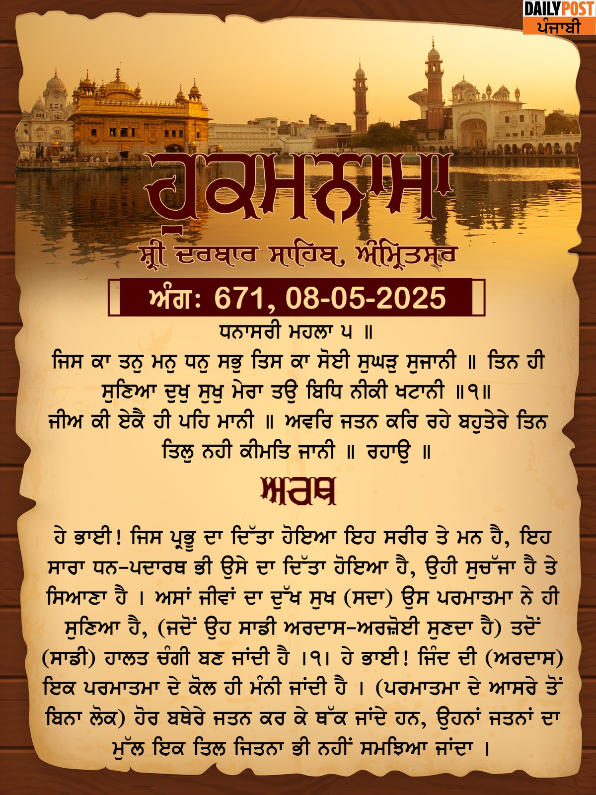 ਸ੍ਰੀ ਦਰਬਾਰ ਸਾਹਿਬ ਤੋਂ ਅੱਜ ਦਾ ਹੁਕਮਨਾਮਾ 8-5-2025
