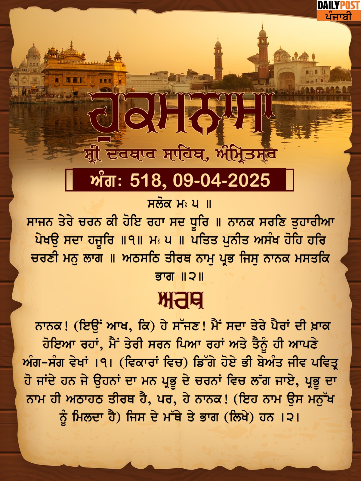 ਸ੍ਰੀ ਦਰਬਾਰ ਸਾਹਿਬ ਤੋਂ ਅੱਜ ਦਾ ਹੁਕਮਨਾਮਾ 9-4-2025