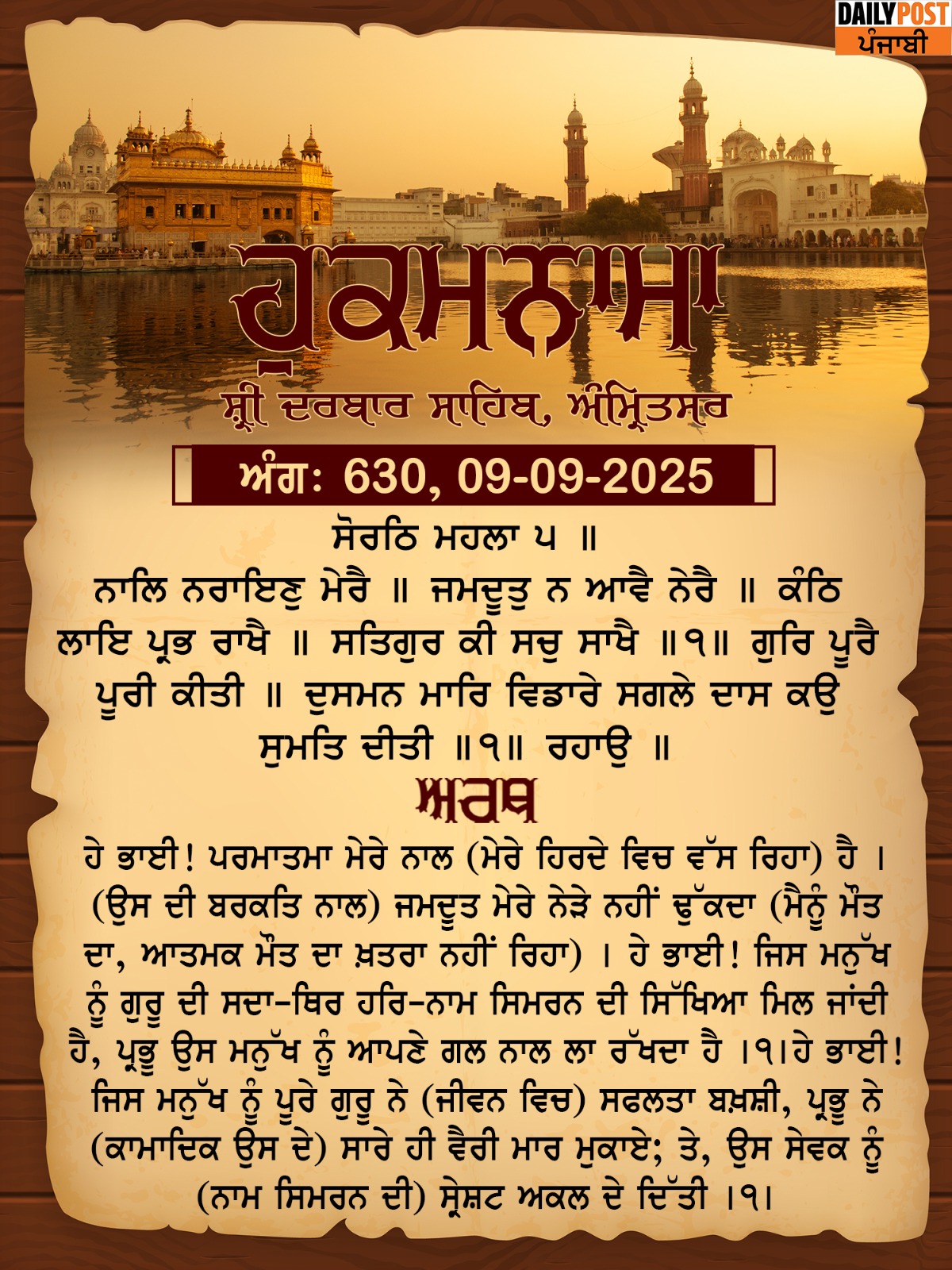 ਸ੍ਰੀ ਦਰਬਾਰ ਸਾਹਿਬ ਤੋਂ ਅੱਜ ਦਾ ਹੁਕਮਨਾਮਾ 9-9-2025