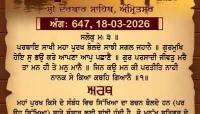 ਸ੍ਰੀ ਦਰਬਾਰ ਸਾਹਿਬ ਤੋਂ ਅੱਜ ਦਾ ਹੁਕਮਨਾਮਾ 18-3-2026