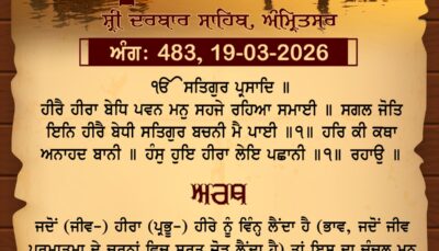 ਸ੍ਰੀ ਦਰਬਾਰ ਸਾਹਿਬ ਤੋਂ ਅੱਜ ਦਾ ਹੁਕਮਨਾਮਾ 19-3-2026