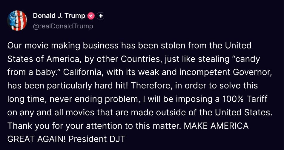 ਟਰੰਪ ਨੇ ਖਾਸ ਤੌਰ ‘ਤੇ ਕੈਲੀਫੋਰਨੀਆ ਦਾ ਜ਼ਿਕਰ ਕੀਤਾ। ਇਸੇ ਸੂਬੇ ਦੇ ਲਾਸ ਏਂਜਲਸ ਵਿਚ ਹਾਲੀਵੁੱਡ ਹੈ। ਟਰੰਪ ਨੇ ਕਿਹਾ ਕਿ ਕੈਲੀਫੋਰਨੀਆ ਦੀ ਕਮਜ਼ੋਰ ਸਰਕਾਰ ਤੇ ਬੁਰੇ ਗਵਰਨਰ ਦੀ ਵਜ੍ਹਾ ਨਾਲ ਇਹ ਸੂਬਾ ਸਭ ਤੋਂ ਵੱਧ ਪ੍ਰਭਾਵਿਤ ਹੋਇਆ ਹੈ। ਟਰੰਪ ਨੇ ਕਿਹਾ ਕਿ ਇਸ ਲੰਬੇ ਸਮੇਂ ਤੋਂ ਚੱਲੀ ਆ ਰਹੀ ਤੇ ਕਦੇ ਨਾ ਖਤਮ ਹੋਣ ਵਾਲੀ ਸਮੱਸਿਆ ਨੂੰ ਖਤਮ ਕਰਨ ਲਈ ਉਹ ਅਮਰੀਕਾ ਦੇ ਬਾਹਰ ਬਣਨ ਵਾਲੀਆਂ ਸਾਰੀਆਂ ਫਿਲਮਾਂ ‘ਤੇ 100 ਫੀਸਦੀ ਟੈਰਿਫ ਲਗਾਉਣਗੇ।