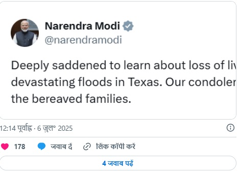 ਇਸ ਦੌਰਾਨ, ਪ੍ਰਧਾਨ ਮੰਤਰੀ ਨਰਿੰਦਰ ਮੋਦੀ ਨੇ ਟੈਕਸਾਸ ਵਿੱਚ ਹੜ੍ਹਾਂ ਵਿੱਚ ਹੋਏ ਜਾਨ-ਮਾਲ ਦੇ ਨੁਕਸਾਨ ‘ਤੇ ਸੰਵੇਦਨਾ ਪ੍ਰਗਟ ਕੀਤੀ। ਪ੍ਰਧਾਨ ਮੰਤਰੀ ਮੋਦੀ ਨੇ X ‘ਤੇ ਇੱਕ ਪੋਸਟ ਵਿੱਚ ਕਿਹਾ, ‘ਟੈਕਸਾਸ ਵਿੱਚ ਆਏ ਵਿਨਾਸ਼ਕਾਰੀ ਹੜ੍ਹਾਂ ਵਿੱਚ ਲੋਕਾਂ, ਖਾਸ ਕਰਕੇ ਬੱਚਿਆਂ ਦੇ ਜਾਨੀ ਨੁਕਸਾਨ ਦੀ ਖ਼ਬਰ ਸੁਣ ਕੇ ਬਹੁਤ ਦੁੱਖ ਹੋਇਆ। ਅਮਰੀਕੀ ਸਰਕਾਰ ਅਤੇ ਸੋਗਗ੍ਰਸਤ ਪਰਿਵਾਰਾਂ ਪ੍ਰਤੀ ਸਾਡੀ ਸੰਵੇਦਨਾ।’