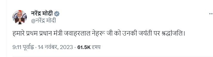 ਪੰਡਿਤ ਜਵਾਹਰ ਲਾਲ ਨਹਿਰੂ ਨੂੰ ਯਾਦ ਕਰਦੇ ਹੋਏ ਕਾਂਗਰਸ ਨੇਤਾ ਰਾਹੁਲ ਗਾਂਧੀ ਨੇ ਸੋਸ਼ਲ ਮੀਡੀਆ ‘ਤੇ ਲਿਖਿਆ, ਪੰਡਿਤ ਜਵਾਹਰ ਲਾਲ ਨਹਿਰੂ ਦਾ ਇਕ ਵਿਚਾਰ ਹੈ- ਆਜ਼ਾਦੀ, ਤਰੱਕੀ, ਨਿਆਂ। ਭਾਰਤ ਮਾਤਾ ਨੂੰ ਅੱਜ ਉਸ ਦੇ ‘ਹਿੰਦ ਦੇ ਗਹਿਣਿਆਂ’ ਦੀ ਕੀਮਤ ‘ਤੇ ਅਸ਼ੁੱਧਤਾ ਦੀ ਯਾਦ ਦਿਵਾਈ ਜਾਵੇ, ਹਰ ਦਿਲ ਵਿਚ ਇਕ ਵੱਖਰੀ ਕਿਸਮ ਦੀ। ਕਾਂਗਰਸ ਦੇ ਰਾਸ਼ਟਰੀ ਪ੍ਰਧਾਨ ਮਲਿਕਾਰਜੁਨ ਖੜਗੇ ਨੇ ਪੰਡਿਤ ਨਹਿਰੂ ਨੂੰ ਯਾਦ ਕਰਦੇ ਹੋਏ ਲਿਖਿਆ, ”ਨਾਗਰਿਕਤਾ ਦੇਸ਼ ਦੀ ਸੇਵਾ ‘ਚ ਹੈ।” ਪੰਡਿਤ ਜਵਾਹਰ ਲਾਲ ਨਹਿਰੂ ਭਾਰਤ ਦੇ ਜ਼ੀਰੋ ਤੋਂ ਸਿਖਰ ਤੱਕ ਦੇ ਸ਼ਾਸਕ, ਆਧੁਨਿਕ ਭਾਰਤ ਦੇ ਨਿਰਮਾਤਾ, ਲੋਕਤੰਤਰ ਦੇ ਨਿਡਰ ਸਰਪ੍ਰਸਤ ਅਤੇ ਸਾਡੇ ਪ੍ਰੇਰਨਾ ਸਰੋਤ, ਪੰਡਿਤ ਜਵਾਹਰ ਲਾਲ ਨਹਿਰੂ ਦੇ ਜਨਮ ਦਿਨ ‘ਤੇ ਸਹੁੰ।