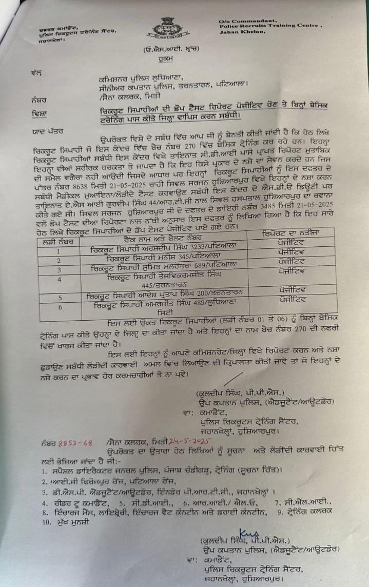 ਜਿਹੜੇ ਸਿਪਾਹੀਆਂ ਦੇ ਡੌਪ ਟੈਸਟ ਪਾਜ਼ੀਟਿਵ ਆਏ ਹਨ ਉਨ੍ਹਾਂ ਵਿਚ ਰਿਕਰੂਟ ਸਿਪਾਹੀ ਅਰਸ਼ਦੀਪ ਸਿੰਘ 3222, ਪਟਿਆਲਾ, ਰਿਕਰੂਟ ਸਿਪਾਹੀ ਮਨੀਸ਼ 345/ਪਟਿਆਲਾ, ਰਿਕਰੂਟ ਸਿਪਾਹੀ ਸੁਮਿਤ ਮਲਹੋਤਰਾ 689/ਪਟਿਆਲਾ, ਰਿਕਰੂਟ ਸਿਪਾਹੀ ਤੇਜਵਿਕਰਮਜੀਤ ਸਿੰਘ 445/ਤਰਨਤਾਰਨ, ਰਿਕਰੂਟ ਸਿਪਾਹੀ ਆਦੇਸ਼ ਪ੍ਰਤਾਪ ਸਿੰਘ 200/ਤਰਨਤਾਰਨ ਤੇ ਰਿਕਰੂਟ ਸਿਪਾਹੀ ਅਮਰਜੀਤ ਸਿੰਘ 489/ ਲੁਧਿਆਣਾ ਸਿਟੀ ਸ਼ਾਮਲ ਹਨ।ਫਿਲਹਾਲ 6 ਸਿਪਾਹੀਆਂ ਦੇ ਡੌਪ ਟੈਸਟ ਦਾ ਪਾਜ਼ੀਟਿਵ ਆਉਣਾ ਆਪਣੇ ਆਪ ਵਿਚ ਵੱਡਾ ਸਵਾਲ ਹੈ ਤੇ ਇਹ ਜਾਂਚ ਦਾ ਵਿਸ਼ਾ ਹੈ। ਅਜਿਹੇ ਵਿਚ ਹੁਣ ਦੇਖਣਾ ਇਹ ਹੋਵੇਗਾ ਕਿ ਜਿਹੜੇ ਸਿਪਾਹੀਆਂ ਦੀ ਡੋਟ ਟੈਸਟ ਦੀ ਰਿਪੋਰਟ ਪਾਜ਼ੀਟਿਵ ਆਈ ਹੈ, ਉਨ੍ਹਾਂ ‘ਤੇ ਹੁਣ ਕੀ ਕਾਰਵਾਈ ਕੀਤੀ ਜਾਵੇਗੀ।