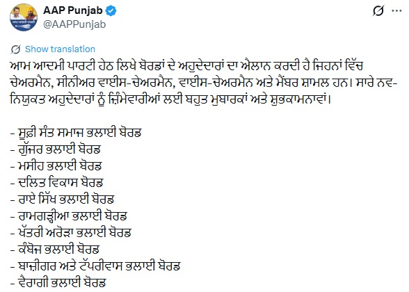 ਆਮ ਆਦਮੀ ਪਾਰਟੀ ਨੇ ਵੱਖ-ਵੱਖ ਬੋਰਡਾਂ ਦੇ ਅਹੁਦੇਦਾਰਾਂ ਦਾ ਕੀਤਾ ਐਲਾਨ, ਦੇਖੋ ਲਿਸਟ
