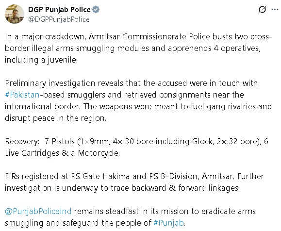 ਇਹ ਜਾਣਕਾਰੀ ਡੀਜੀਪੀ ਗੌਰਵ ਯਾਦਵ ਵੱਲੋਂ ਸਾਂਝੀ ਕੀਤੀ ਗਈ। ਉਨ੍ਹਾਂ ਦੱਸਿਆ ਕਿ ਮੁਲਜ਼ਮ ਪਾਕਿਸਤਾਨ ਆਧਾਰਿਤ ਤਸਕਰਾਂ ਦੇ ਸੰਪਰਕ ਵਿਚ ਸਨ ਤੇ ਸਰਹੱਦ ਨੇੜਿਓਂ ਹਥਿਆਰ ਪ੍ਰਾਪਤ ਕਰਦੇ ਸਨ। ਮੁਲਜ਼ਮਾਂ ਕੋਲੋਂ 7 ਪਿਸਤੌਲ, 6 ਜ਼ਿੰਦਾ ਕਾਰਤੂਸ ਤੇ ਇੱਕ ਮੋਟਰਸਾਈਕਲ ਬਰਾਮਦ ਕੀਤਾ ਗਿਆ ਹੈ।