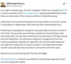 ਡੀਜੀਪੀ ਗੌਰਵ ਯਾਦਵ ਨੇ ਦੱਸਿਆ ਕਿ ਮੁਲਜ਼ਮ ਵਿਸ਼ਾਲ ਨੇ ਪਿਛਲੇ ਸਾਲ ਸਤੰਬਰ ਮਹੀਨੇ ਵਿਚ ਡੇਰਾ ਬੱਸੀ ਵਿਚ ਇਕ ਆਈਲੈਟਸ ਸੈਂਟਰ ‘ਤੇ ਫਾਇਰਿੰਗ ਕੀਤੀ ਸੀ। ਵਿਸ਼ਾਲ ਉਸ ਘਟਨਾ ਦਾ ਮਾਸਟਰਮਾਈਂਡ ਸੀ ਤੇ ਉਦੋਂ ਤੋਂ ਫਰਾਰ ਸੀ। ਸ਼ੁਰੂਆਤੀ ਜਾਂਚ ਤੋਂ ਪਤਾ ਲੱਗਾ ਹੈ ਕਿ ਉਹ ਟ੍ਰਾਈਸਿਟੀ ਵਿਚ ਅਪਰਾਧ ਕਰਨ ਦੀ ਯੋਜਨਾ ਬਣਾ ਰਿਹਾ ਸੀ। ਵਿਸ਼ਾਲ ਖਾਨ ਦਾ ਪਹਿਲਾ ਅਪਰਾਧਿਕ ਰਿਕਾਰਡ ਪੁਲਿਸ ਸਾਰੇ ਥਾਣਿਆਂ ਤੋਂ ਕਢਵਾ ਰਹੀ ਹੈ। ਮੁਲਜ਼ਮ ‘ਤੇ 10 ਦੇ ਲਗਭਗ ਮਾਮਲੇ ਦਰਜ ਹਨ।