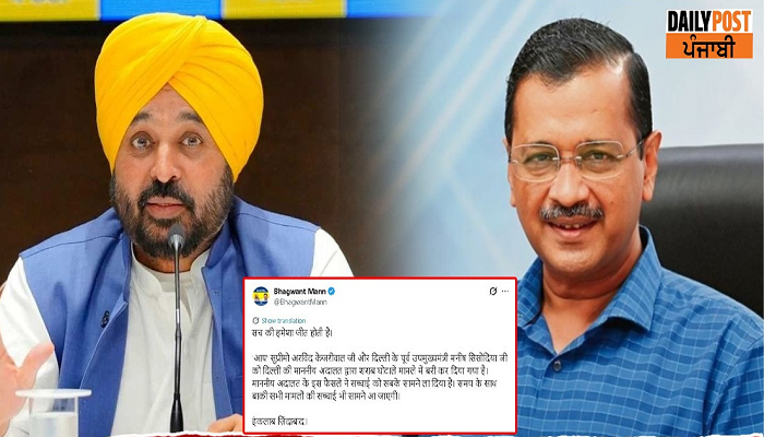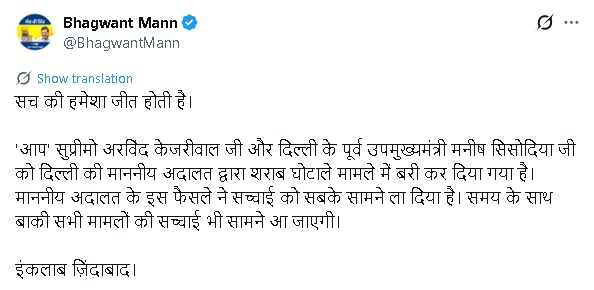 ਕੇਜਰੀਵਾਲ ਤੇ ਮਨੀਸ਼ ਸਿਸੋਦੀਆ ਦੇ ਬਰੀ ਹੋਣ ਮਗਰੋਂ ਪੰਜਾਬ ਦੇ ਮੁੱਖ ਮੰਤਰੀ ਭਗਵੰਤ ਮਾਨ ਨੇ ਟਵੀਟ ਕੀਤਾ ਤੇ ਕਿਹਾ ਕਿ ‘ਸੱਚ ਦੀ ਹਮੇਸ਼ਾ ਜਿੱਤ ਹੁੰਦੀ ਹੈ’। ‘ਆਪ’ ਸੁਪਰੀਮੋ ਅਰਵਿੰਦ ਕੇਜਰੀਵਾਲ ਜੀ ਤੇ ਦਿੱਲੀ ਦੇ ਉਪ ਮੁੱਖ ਮੰਤਰੀ ਮਨੀਸ਼ ਸਿਸੋਦੀਆ ਜੀ ਨੂੰ ਦਿੱਲੀ ਦੀ ਮਾਣਯੋਗ ਅਦਾਲਤ ਵੱਲੋਂ ਸ਼ਰਾਬ ਘੋਟਾਲੇ ਵਿਚੋਂ ਬਰੀ ਕਰ ਦਿੱਤਾ ਗਿਆ ਹੈ। ਮਾਣਯੋਗ ਅਦਾਲਤ ਦੇ ਇਸ ਫੈਸਲੇ ਨੇ ਸੱਚਾਈ ਨੂੰ ਸਾਰਿਆਂ ਸਾਹਮਣੇ ਲਿਆ ਦਿੱਤਾ ਹੈ। ਸਮੇਂ ਦੇ ਨਾਲ ਬਾਕੀ ਸਾਰੇ ਮਾਮਲਿਆਂ ਦੀ ਸੱਚਾਈ ਵੀ ਸਾਹਮਣੇ ਆ ਜਾਵੇਗੀ। ਇਨਕਲਾਬ ਜ਼ਿੰਦਾਬਾਦ!