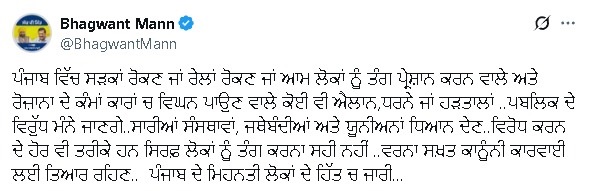 ਪੰਜਾਬ ‘ਚ ਧਰਨਾ ਪ੍ਰਦਰਸ਼ਨ ਕਰਨ ਵਾਲਿਆਂ ਨੂੰ CM ਮਾਨ ਦੀ ਚਿਤਾਵਨੀ, ਬੋਲੇ- ‘…ਹੋਵੇਗੀ ਸਖਤ ਕਾਰਵਾਈ’