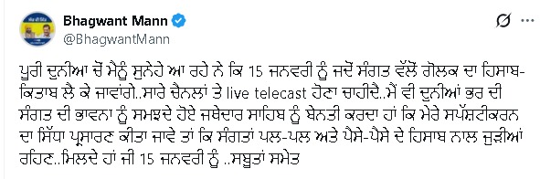 CM ਮਾਨ ਨੇ ਟਵੀਟ ਕਰਦਿਆਂ ਕਿਹਾ ਕਿ ਪੂਰੀ ਦੁਨੀਆ ‘ਚੋਂ ਮੈਨੂੰ ਸੁਨੇਹੇ ਆ ਰਹੇ ਹਨ ਕਿ 15 ਜਨਵਰੀ ਨੂੰ ਜਦੋਂ ਸੰਗਤ ਵੱਲੋਂ ਗੋਲਕ ਦਾ ਹਿਸਾਬ ਕਿਤਾਬ ਲੈ ਕੇ ਜਾਵਾਂਗੇ…ਸਾਰੇ ਚੈਨਲਾਂ ‘ਤੇ live telecast ਹੋਣਾ ਚਾਹੀਦੈ…ਮੈਂ ਵੀ ਦੁਨੀਆ ਭਰ ਦੀ ਸੰਗਤ ਦੀ ਭਾਵਨਾ ਨੂੰ ਸਮਝਦੇ ਹੋਏ ਜਥੇਦਾਰ ਸਾਹਿਬ ਨੂੰ ਬੇਨਤੀ ਕਰਦਾ ਹਾਂ ਕਿ ਮੇਰੇ ਸਪੱਸ਼ਟੀਕਰਨ ਦਾ ਸਿੱਧਾ ਪ੍ਰਸਾਰਣ ਕੀਤਾ ਜਾਵੇ ਤਾਂ ਕਿ ਸੰਗਤਾਂ ਪਲ-ਪਲ ਤੇ ਪੈਸੇ-ਪੈਸੇ ਦੇ ਹਿਸਾਬ ਨਾਲ ਜੁੜੀਆਂ ਰਹਿਣ…ਮਿਲਦੇ ਹਾਂ ਜੀ 15 ਜਨਵਰੀ ਨੂੰ…ਸਬੂਤਾਂ ਸਮੇਤ।