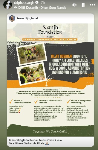 ਇਨ੍ਹਾਂ ਸਭ ਦੇ ਵਿਚਾਲੇ ਪੰਜਾਬੀ ਗਾਇਕ ਦਿਲਜੀਤ ਦੁਸਾਂਝ ਨੇ ਹੜ੍ਹ ਪੀੜਤਾਂ ਲਈ ਨੇਕ ਪਹਿਲ ਕੀਤੀ ਹੈ। ਦਿਲਜੀਤ ਦੋਸਾਂਝ ਦੇ ਸਾਂਝ ਫਾਊਂਡੇਸ਼ਨ ਨੇ ਹੜ੍ਹ ਪ੍ਰਭਾਵਿਤ 10 ਪਿੰਡਾਂ ਨੂੰ ਗੋਦ ਲੈਣ ਦਾ ਐਲਾਨ ਕੀਤਾ ਹੈ। ਫਾਊਂਡੇਸ਼ਨ ਨੇ ਐਲਾਨ ਕੀਤਾ ਹੈ ਕਿ ਉਹ ਹੋਰ ਗੈਰ-ਸਰਕਾਰੀ ਸੰਗਠਨਾਂ ਅਤੇ ਸਥਾਨਕ ਪ੍ਰਸ਼ਾਸਨ ਦੇ ਸਹਿਯੋਗ ਨਾਲ ਹੜ੍ਹ ਰਾਹਤ ਕਾਰਜਾਂ ਦੀ ਹਮਾਇਤ ਲਈ ਗੁਰਦਾਸਪੁਰ ਅਤੇ ਅੰਮ੍ਰਿਤਸਰ ਦੇ 10 ਬਹੁਤ ਪ੍ਰਭਾਵਿਤ ਪਿੰਡਾਂ ਨੂੰ ਗੋਦ ਲੈ ਰਿਹਾ ਹੈ। ਫਾਊਂਡੇਸ਼ਨ ਨੇ ਐਲਾਨ ਕੀਤਾ ਹੈ ਕਿ ਉਹ ਅੰਮ੍ਰਿਤਸਰ ਤੇ ਗੁਰਦਾਸਪੁਰ ਦੇ 10 ਪਿੰਡਾਂ ਦੀ ਦੇਖਭਾਲ ਕਰਨਗੇ।
