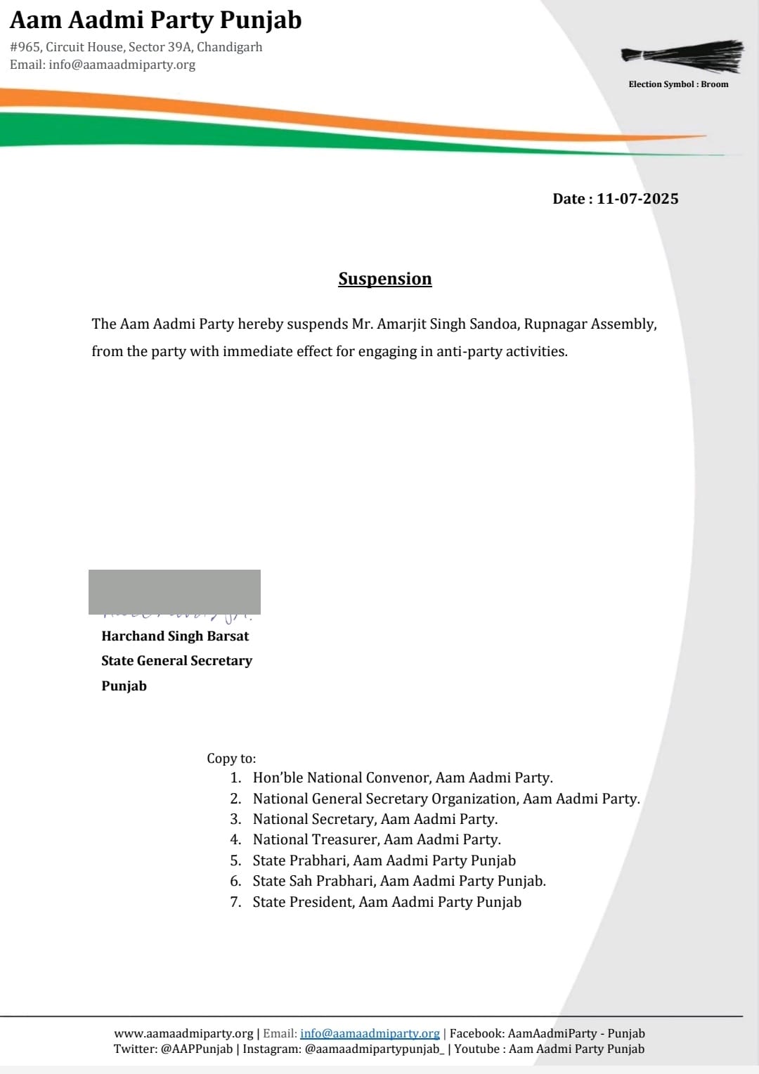 ਕਾਂਗਰਸ ਤੋਂ ਬਾਅਦ ਸੰਦੋਆ ਆਮ ਆਦਮੀ ਪਾਰਟੀ ਵਿਚ ਸ਼ਾਮਲ ਹੋਏ ਸੀ ਜਿਨ੍ਹਾਂ ਨੂੰ ਹੁਣ ਪਾਰਟੀ ਵਿਚੋਂ ਬਾਹਰ ਕੱਢਿਆ ਗਿਆ ਹੈ। ਅਮਰਜੀਤ ਸਿੰਘ ਸੰਦੋਆ ਰੋਪੜ ਤੋਂ ਸਾਬਕਾ ਵਿਧਾਇਕ ਹਨ। ਇਸ ਸਬੰਧੀ ਸਟੇਟ ਜਨਰਲ ਸੈਕਟਰੀ ਹਰਚੰਦ ਸਿੰਘ ਦੇ ਦਸਤਖਤਾਂ ਹੇਠ ਪੱਤਰ ਵੀ ਜਾਰੀ ਕੀਤਾ ਗਿਆ ਜਿਸ ਵਿਚ ਕਿਹਾ ਗਿਆ ਹੈ ਕਿ ਅਮਰਜੀਤ ਸਿੰਘ ਸੰਦੋਆ ਪਾਰਟੀ ਵਿਰੁੱਧ ਬੋਲਦੇ ਹਨ ਜਿਸ ਦੇ ਚੱਲਦੇ ਉਨ੍ਹਾਂ ਨੂੰ ਪਾਰਟੀ ਵਿਚੋਂ ਬਾਹਰ ਕੱਢਿਆ ਗਿਆ ਹੈ।