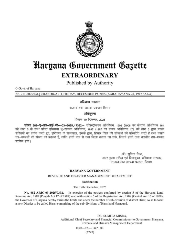 ਹਰਿਆਣਾ ਦਾ 23ਵਾਂ ਜ਼ਿਲ੍ਹਾ ਬਣਿਆ ਹਾਂਸੀ, 110 ਪਿੰਡ ਕੀਤੇ ਜਾਣਗੇ ਸ਼ਾਮਲ; CM ਸੈਣੀ ਨੇ ਕੀਤਾ ਸੀ ਐਲਾਨ