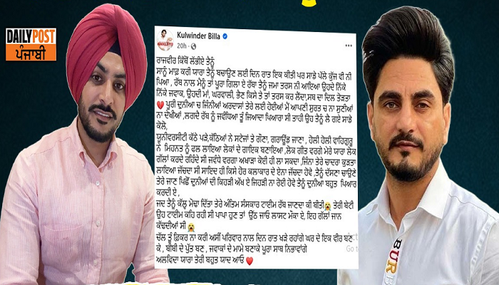ਕੁਲਵਿੰਦਰ ਬਿੱਲਾ ਨੇ ਰਾਜਵੀਰ ਜਵੰਦਾ ਦੇ ਜਾਣ ਦਾ ਦੁੱਖ ਨਹੀਂ ਭੁੱਲ ਪਾ ਰਹੇ ਹਨ। ਜਵੰਦਾ ਨੂੰ ਯਾਦ ਕਰਦਿਆਂ ਕੁਲਵਿੰਦਰ ਬਿੱਲਾ ਨੇ ਭਾਵੁਕ ਪੋਸਟ ਕੀਤੀ ਸਾਂਝੀ ਹੈ। ਪੋਸਟ ਵਿਚ ਉਨ੍ਹਾਂ ਲਿਖਿਆ-