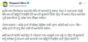 ਪੰਜਾਬ ਸਰਕਾਰ 1 ਕਰੋੜ ਰੁਪਏ ਦੀ ਐਕਸ ਗ੍ਰੇਸ਼ੀਆ ਰਾਸ਼ੀ ਪ੍ਰਦਾਨ ਕਰੇਗੀ ਤੇ HDFC ਬੈਂਕ 1 ਕਰੋੜ ਰੁਪਏ ਦੀ ਵਾਧੂ ਬੀਮਾ ਰਾਸ਼ੀ ਦੀ ਅਦਾਇਗੀ ਕਰੇਗਾ। ਅਸੀਂ ਆਪਣੇ ਸ਼ਹੀਦਾਂ ਤੇ ਉਨ੍ਹਾਂ ਦੇ ਪਰਿਵਾਰਾਂ ਨਾਲ ਮਜ਼ਬੂਤੀ ਨਾਲ ਖੜ੍ਹੇ ਹਾਂ। ਉਨ੍ਹਾਂ ਦੀ ਕੁਰਬਾਨੀ ਸਾਨੂੰ ਸਾਰਿਆਂ ਨੂੰ ਸਨਮਾਨ ਤੇ ਬਹਾਦਰੀ ਨਾਲ ਡਿਊਟੀ ਨਿਭਾਉਣ ਲਈ ਪ੍ਰੇਰਿਤ ਕਰਦੀ ਹੈ।