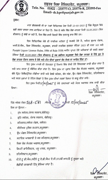 ਭਾਰਤੀ ਨਾਗਰਿਕ ਸੁਰਕਸ਼ਾ ਸੰਹਿਤਾ 2023 ਦੀ ਧਾਰਾ 163 ਤੇ ਪੰਜਾਬ ਲੀਕਰ ਲਾਇਸੈਂਸ ਰੂਲਜ 1956 ਦੀ ਧਾਰਾ 37 (9) ਤਹਿਤ ਪ੍ਰਾਪਤ ਅਧਿਕਾਰਾਂ ਦੀ ਵਰਤੋਂ ਕਰਦੇ ਹੋਏ ਸ੍ਰੀ ਪੰਚਾਲ ਨੇ ਕਿਹਾ ਕਿ ਮੇਲੇ ਦੀ ਧਾਰਮਿਕ ਮਹੱਤਤਾ ਦੇ ਮੱਦੇਨਜ਼ਰ 22 ਮਈ ਨੂੰ ਸਬ ਡਵੀਜ਼ਨ ਕਪੂਰਥਲਾ ਵਿਖੇ ਸ਼ੋਭਾ ਯਾਤਰਾ ਦੇ ਪੈਂਦੇ ਰੂਟ ’ਤੇ ਸ਼ੋਭਾ ਯਾਤਰਾ ਦੌਰਾਨ ਸ਼ਰਾਬਟ ਦੇ ਠੇਕੇ ਤੇ ਮੀਟ ਦੀਆਂ ਦੁਕਾਨਾਂ ਬੰਦ ਰੱਖੀਆਂ ਜਾਣਗੀਆਂ।