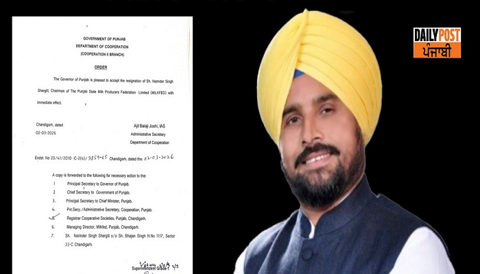 ਮਿਲਕ ਫੈੱਡ ਦੇ ਚੇਅਰਮੈਨ ਨਰਿੰਦਰ ਸ਼ੇਰਗਿੱਲ ਨੇ ਦਿੱਤਾ ਅਸਤੀਫ਼ਾ, ਤੁਰੰਤ ਪ੍ਰਭਾਵ ਨਾਲ ਅਸਤੀਫਾ ਹੋਇਆ ਮਨਜ਼ੂਰ