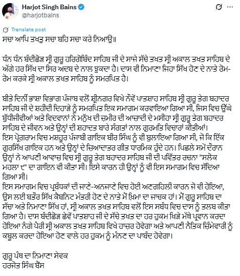 ਸ੍ਰੀ ਅਕਾਲ ਤਖਤ ਸਾਹਿਬ ਵੱਲੋਂ ਤਲਬ ਕੀਤੇ ਜਾਣ ਦੇ ਬਾਅਦ ਮੰਤਰੀ ਬੈਂਸ ਦਾ ਵੱਡਾ ਬਿਆਨ ਸਾਹਮਣੇ ਆਇਆ ਹੈ। ਉਨ੍ਹਾਂ ਲਿਖਿਆ-ਸਚਾ ਆਪਿ ਤਖਤੁ ਸਚਾ ਬਹਿ ਸਚਾ ਕਰੇ ਨਿਆਊ। ਧੰਨ-ਧੰਨ ਬੰਦੀਛੋੜ ਸ੍ਰੀ ਗੁਰੂ ਹਰਿਗੋਬਿੰਦ ਸਾਹਿਬ ਜੀ ਦੇ ਸਾਜੇ ਸੱਚੇ ਤਖਤ ਸ੍ਰੀ ਅਕਾਲ ਤਖਤ ਸਾਹਿਬ ਦੇ ਅੱਗੇ ਹਰ ਸਿੱਖ ਦਾ ਸਿਰ ਅਦਬ ਦੇ ਨਾਲ ਝੁਕਦਾ ਹੈ। ਦਾਸ ਵੀ ਨਿਮਾਣਾ ਜਿਹਾ ਸਿੱਖ ਹੋਣ ਦੇ ਨਾਤੇ ਰੋਮ-ਰੋਮ ਕਰਕੇ ਸ੍ਰੀ ਅਕਾਲ ਤਖਤ ਸਾਹਿਬ ਨੂੰ ਸਮਰਿਪਤ ਹੈ।