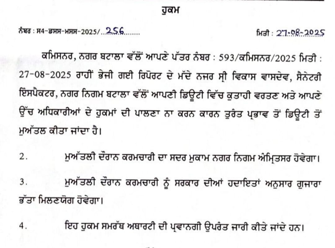 MLA ਸ਼ੈਰੀ ਕਲਸੀ ਵੱਲੋਂ ਨਗਰ ਨਿਗਮ ਬਟਾਲਾ ਦਾ ਸੈਨੇਟਰੀ ਇੰਸਪੈਕਟਰ ਮੁਅੱਤਲ, ਡਿਊਟੀ ‘ਚ ਕੁਤਾਹੀ ਵਰਤਣ ਕਰਕੇ ਲਿਆ ਐਕਸ਼ਨ