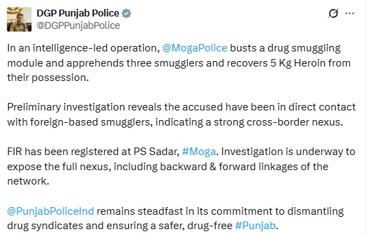 ਜਾਣਕਾਰੀ ਦਿੰਦਿਆਂ ਡੀਜੀਪੀ ਨੇ ਦੱਸਿਆ ਕਿ ਪੰਜਾਬ ਪੁਲਿਸ ਨੇ ਵੱਡੀ ਸਫਲਤਾ ਹਾਸਲ ਕਰਦੇ ਹੋਏ ਨਸ਼ਾ ਤਸਕਰੀ ਦੇ ਗਿਰੋਹ ਦਾ ਪਰਦਾਫਾਸ਼ ਕੀਤਾ ਹੈ। ਇਸ ਤਹਿਤ ਮੋਗਾ ਪੁਲਿਸ ਨੇ 3 ਤਸਕਰਾਂ ਨੂੰ ਕਾਬੂ ਕੀਤਾ ਹੈ। ਮੁਲਜ਼ਮ ਵਿਦੇਸ਼ੀ ਤਸਕਰਾਂ ਨਾਲ ਸਿੱਧੇ ਸੰਪਰਕ ਵਿੱਚ ਸਨ, ਜਿਸ ਨਾਲ ਸ਼ੱਕ ਪੈਦਾ ਹੁੰਦਾ ਹੈ ਕਿ ਉਹ ਸਰਹੱਦ ਪਾਰ ਰੈਕੇਟ ਵਿੱਚ ਸ਼ਾਮਲ ਸਨ। ਇਸ ਸਬੰਧੀ ਸਦਰ ਪੁਲਿਸ ਸਟੇਸ਼ਨ, ਮੋਗਾ ਵਿਖੇ ਮਾਮਲਾ ਦਰਜ ਕਰ ਲਿਆ ਗਿਆ ਹੈ ਤੇ ਅੱਗੇ ਦੀ ਕਾਰਵਾਈ ਜਾਰੀ ਹੈ।