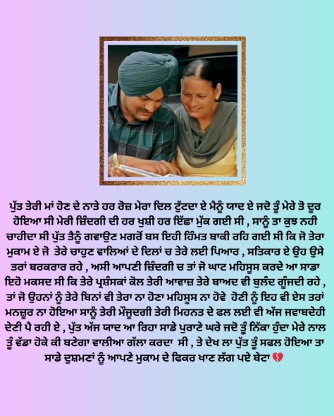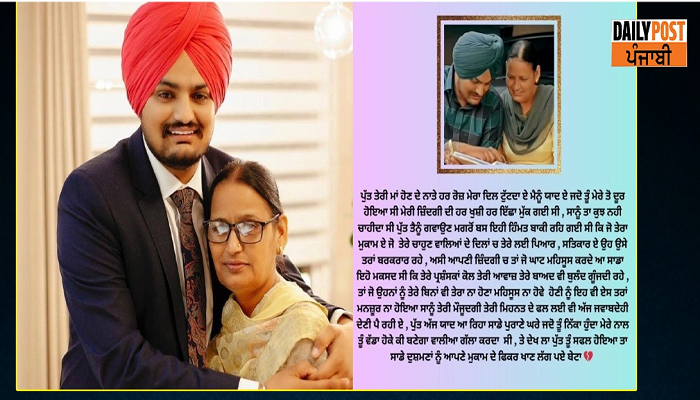ਉਨ੍ਹਾਂ ਲਿਖਿਆ ਕਿ ਪੁੱਤ ਤੇਰੀ ਮਾਂ ਹੋਣ ਦੇ ਨਾਤੇ ਹਰ ਰੋਜ਼ ਮੇਰਾ ਦਿਲ ਟੁੱਟਦਾ ਹੈ। ਜਦੋਂ ਤੂੰ ਮੇਰੇ ਤੋਂ ਦੂਰ ਹੋਇਆ ਸੀ ਮੇਰੀ ਜ਼ਿੰਦਗੀ ਦੀ ਹਰ ਖੁਸ਼ੀ ਮੁੱਕ ਗਈ ਸੀ । ਸਾਨੂੰਤਾਂ ਕੁਝ ਨਹੀਂ ਚਾਹੀਦਾ ਸੀ ਪੁੱਤ ਤੈਨੂੰ ਗਵਾਉਣ ਮਗਰੋਂ ਬਸ ਇਹੀ ਹਿੰਮਤ ਬਾਕੀ ਰਹਿ ਗਈ ਸੀ ਕਿ ਜੋ ਤੇਰਾ ਮੁਕਾਮ ਏ ਜੋ ਤੇਰੇ ਚਾਹੁਣ ਵਾਲਿਆਂ ਦੇ ਦਿਲਾਂ ਵਿਚ ਤੇਰੇ ਲਈ ਪਿਆਰ, ਸਤਿਕਾਰ ਏ ਉਹ ਇਸੇ ਤਰ੍ਹਾਂ ਬਰਕਰਾਰ ਰਹੇ। ਅਸੀਂ ਆਪਣੀ ਜ਼ਿੰਦਗੀ ਵਿਚ ਤਾਂ ਜੋ ਘਾਟ ਮਹਿਸੂਸ ਕਰਦੇ ਆ ਸਾਡਾ ਇਹੋ ਸਾਡਾ ਮਕਸਦ ਸੀ ਕਿ ਤੇਰੇ ਪ੍ਰਸ਼ੰਸਕਾਂ ਕੋਲ ਤੇਰੀ ਆਵਾਜ਼ ਹਮੇਸ਼ਾ ਗੂੰਜਦੀ ਰਹੇ ਪਰ ਹੋਣੀ ਨੂੰ ਇਹ ਵੀ ਇਸ ਤਰ੍ਹਾਂ ਮਨਜ਼ੂਰ ਨਹੀਂ ਹੋਇਆ। ਸਾਨੂੰ ਤੇਰੀ ਮੌਜੂਦਗੀ ਤੇਰੀ ਮਿਹਨਤ ਦੇ ਫਲ ਲਈ ਵੀ ਅੱਜ ਜਵਾਬਦੇਹੀ ਦੇਣੀ ਪੈ ਰਹੀ ਏ, ਪੁੱਤ ਅੱਜ ਯਾਦ ਆ ਰਿਹਾ ਸਾਡੇ ਪੁਰਾਣੇ ਘਰੇ ਜਦੋਂ ਤੂੰ ਨਿੱਕਾ ਹੁੰਦਾ ਮੇਰੇ ਨਾਲ ਤੂੰ ਵੱਡਾ ਹੋ ਕੇ ਕੀ ਬਣੇਗਾ ਵਾਲੀਆਂ ਗੱਲਾਂ ਕਰਦਾ ਸੀ ਤੇ ਦੇਖ ਲਾ ਪੁੱਤ ਨੂੰ ਸਫਲ ਹੋਇਆ ਤਾਂ ਸਾਡੇ ਦੁਸ਼ਮਣਾਂ ਨੂੰ ਆਪਣੇ ਮੁਕਾਮ ਦੇ ਫਿਕਰ ਖਾਣ ਲੱਗ ਪਏ ਬੇਟਾ।