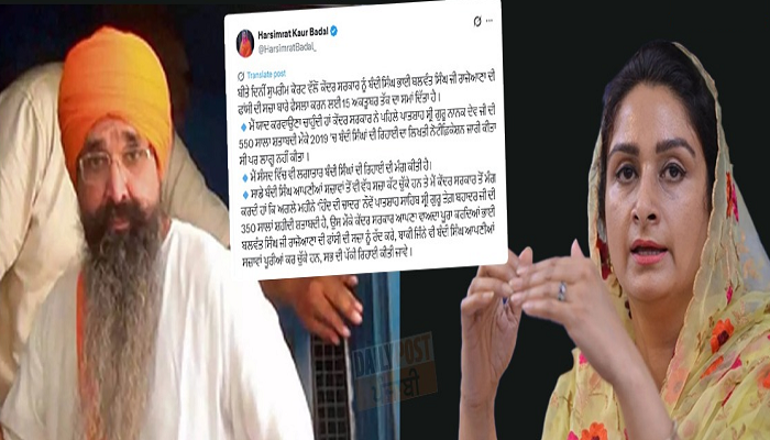 MP ਹਰਸਿਮਰਤ ਕੌਰ ਬਾਦਲ ਨੇ ਕੇਂਦਰ ਤੋਂ ਭਾਈ ਬਲਵੰਤ ਸਿੰਘ ਰਾਜੋਆਣਾ ਦੀ ਰਿਹਾਈ ਦੀ ਕੀਤੀ ਮੰਗ