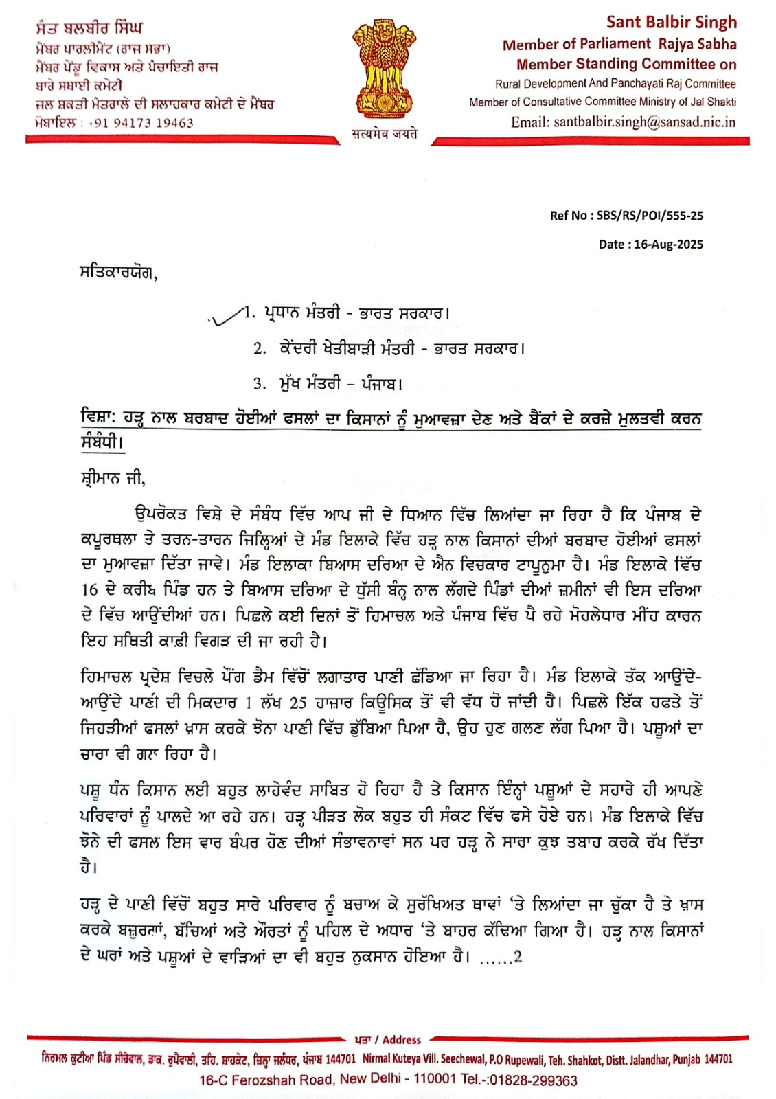 ਇਸੇ ਤਹਿਤ ਸੰਸਦ ਮੈਂਬਰ ਸੰਤ ਸੀਚੇਵਾਲ ਨੇ ਪ੍ਰਧਾਨ ਮੰਤਰੀ ਨਰਿੰਦਰ ਮੋਦੀ, ਕੇਂਦਰੀ ਖੇਤੀਬਾੜੀ ਮੰਤਰੀ ਸ਼ਿਵਰਾਜ ਚੌਹਾਨ ਤੇ CM ਭਗਵੰਤ ਮਾਨ ਨੂੰ ਚਿੱਠੀ ਲਿਖੀ ਹੈ ਜਿਸ ਵਿਚ ਉਨ੍ਹਾਂ ਨੇ ਬੈਂਕਾਂ ਦੇ ਕਰਜ਼ੇ ਦੀਆਂ ਕਿਸ਼ਤਾਂ ਅੱਗੇ ਪਾਉਣ ਤੇ ਪੀੜਤ ਕਿਸਾਨਾਂ ਨੂੰ ਮੁਆਵਜ਼ਾ ਦੇਣ ਦੀ ਮੰਗ ਕੀਤੀ ਹੈ ਤੇ ਨਾਲ ਹੀ ਪੀੜਤ ਕਿਸਾਨਾਂ ਦੇ ਖੇਤਾਂ ਦੀਆਂ ਵਿਸ਼ੇਸ਼ ਗਿਰਦਾਵਰੀਆਂ ਵੀ ਕਰਵਾਉਣ ਦੀ ਮੰਗ ਕੀਤੀ ਹੈ।