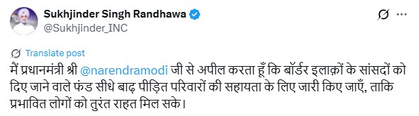 ਹੜ੍ਹ ਪੀੜਤਾਂ ਦੀ ਮਦਦ ਲਈ ਅੱਗੇ ਆਏ MP ਸੁਖਜਿੰਦਰ ਰੰਧਾਵਾ, ਟਵੀਟ ਕਰਕੇ PM ਮੋਦੀ ਨੂੰ ਕੀਤੀ ਇਹ ਅਪੀਲ