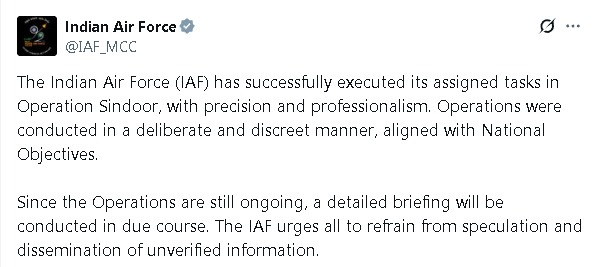 ਭਾਰਤੀ ਹਵਾਈ ਸੈਨਾ (IAF) ਨੇ ਆਪ੍ਰੇਸ਼ਨ ਸਿੰਦੂਰ ਵਿੱਚ ਆਪਣੇ ਨਿਰਧਾਰਤ ਕਾਰਜਾਂ ਨੂੰ ਸ਼ੁੱਧਤਾ ਅਤੇ ਪੇਸ਼ੇਵਰਤਾ ਨਾਲ ਸਫਲਤਾਪੂਰਵਕ ਨਿਭਾਇਆ ਹੈ। ਹੁਣ ਤੱਕ ਜੋ ਵੀ ਕੰਮ ਦਿੱਤਾ ਗਿਆ ਸੀ ਉਹ ਪੂਰਾ ਹੋ ਗਿਆ ਹੈ। ਇਹ ਕਾਰਵਾਈਆਂ ਰਾਸ਼ਟਰੀ ਉਦੇਸ਼ਾਂ ਦੇ ਅਨੁਸਾਰ ਸੋਚ-ਸਮਝ ਕੇ ਅਤੇ ਸਮਝਦਾਰੀ ਨਾਲ ਕੀਤੀਆਂ ਗਈਆਂ।