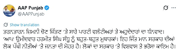 ਤਰਨਤਾਰਨ ਜ਼ਿਮਨੀ ਚੋਣ ‘ਚ ਜਿੱਤ ਮਗਰੋਂ ‘ਆਪ’ ਨੇ ਸਾਂਝੀ ਕੀਤੀ ਪੋਸਟ, ਕਿਹਾ-ਲੋਕਾਂ ਦਾ ਸਰਕਾਰ ‘ਤੇ ਭਰੋਸਾ ਕਾਇਮ ਹੈ”