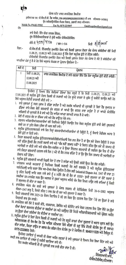 ਦੱਸ ਦੇਈਏ ਕਿ ਬਿਜਲੀ ਮੁਲਾਜ਼ਮ ਏਕਤਾ ਮੰਚ ਨੇ 11 ਤੋਂ 13 ਅਗਸਤ ਤੱਕ ਤਿੰਨ ਦਿਨਾਂ ਦੀ ਸਮੂਹਿਕ ਛੁੱਟੀ ਲੈ ਕੇ ਹੜਤਾਲ ਦਾ ਐਲਾਨ ਕੀਤਾ ਹੈ ਤੇ ਪਾਵਰਕਾਮ ਵਲੋਂ ਅਜਿਹਾ ਇਸ ਲਈ ਕੀਤਾ ਗਿਆ ਹੈ ਤਾਂ ਜੋ ਆਮ ਜਨਤਾ ਨੂੰ ਕਿਸੇ ਤਰ੍ਹਾਂ ਦੀ ਪਰੇਸ਼ਾਨੀ ਦਾ ਸਾਹਮਣਾ ਨਾ ਕਰਨਾ ਪਵੇ।
