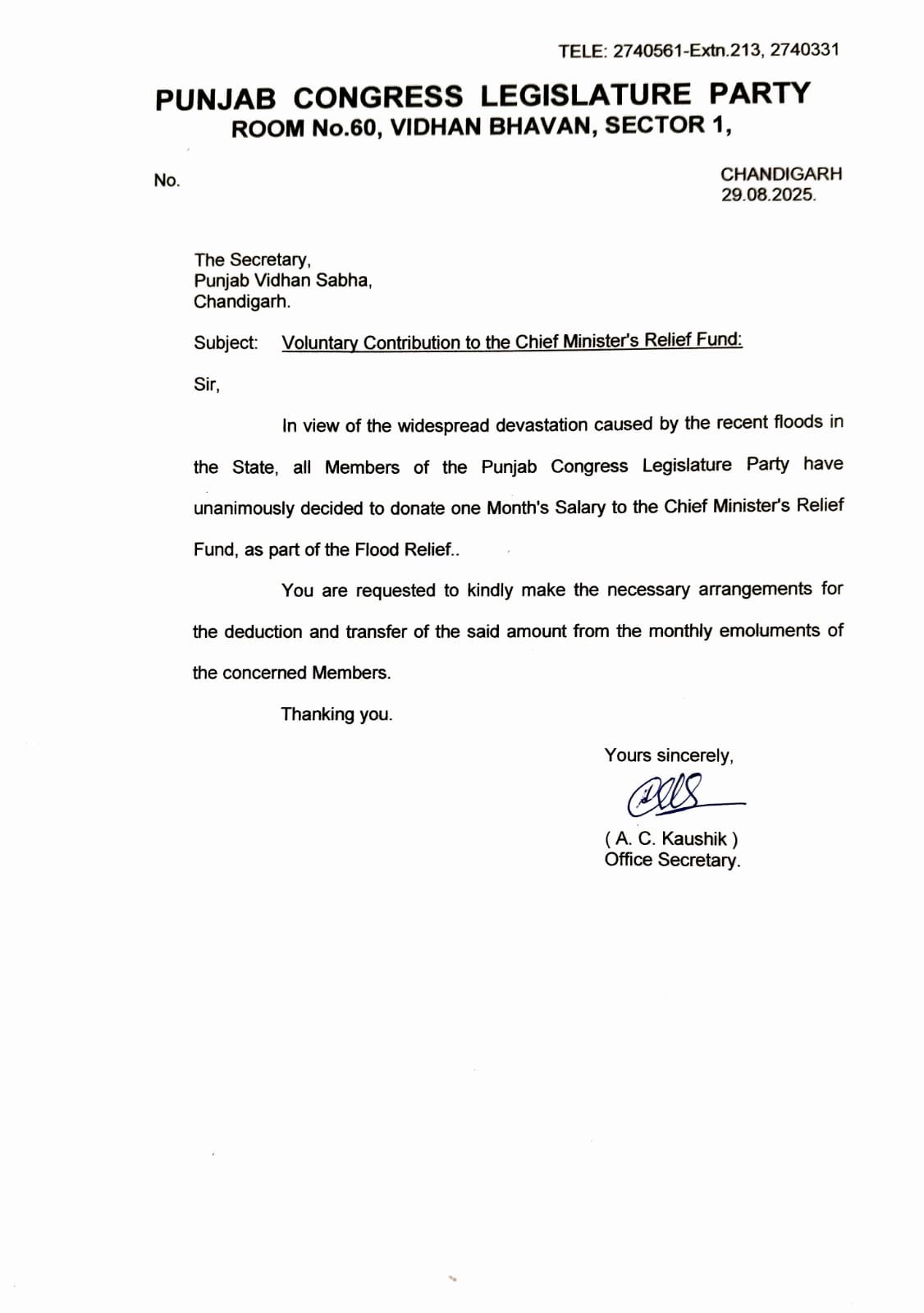 ਹੜ੍ਹ ਪ੍ਰਭਾਵਿਤ ਲੋਕਾਂ ਦੀ ਮਦਦ ਕਰਨਗੇ ਪੰਜਾਬ ਕਾਂਗਰਸ ਦੇ ਵਿਧਾਇਕ, ਦੇਣਗੇ ਇਕ ਮਹੀਨੇ ਦੀ ਤਨਖਾਹ
