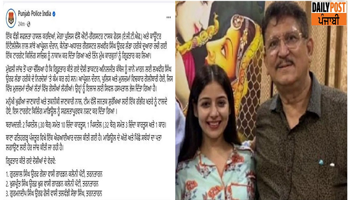 ਦੱਸ ਦੇਈਏ ਕਿ ਮੋਗਾ ਜ਼ਿਲ੍ਹੇ ਦੇ ਕੋਟ ਈਸੇ ਖਾ ਵਿਖੇ 4 ਜੁਲਾਈ ਨੂੰ ਕਲੀਨਿਕ ‘ਤੇ ਦਵਾਈ ਲੈਣ ਦੇ ਬਹਾਨੇ ਆਏ ਨੌਜਵਾਨਾਂ ਨੇ ਡਾਕਟਰ ਅਨਿਲ ਕੰਬੋਜ ਨੂੰ ਗੋਲੀ ਮਾਰੀ ਸੀ। ਉਨ੍ਹਾਂ ਦੀ ਹਾਲਤ ਅਜੇ ਵੀ ਗੰਭੀਰ ਹੈ। ਮੁਲਜ਼ਮਾਂ ਦੀ ਪਛਾਣ ਗੁਰਲਾਲ, ਖੁਸ਼ਪ੍ਰੀਤ ਤੇ ਗੁਰਮਨ ਵਜੋਂ ਹੋਈ ਹੈ। ਉਹ ਤਰਨਤਾਰਨ ਦੇ ਰਹਿਣ ਵਾਲੇ ਹਨ। ਡੀਜੀਪੀ ਗੌਰਵ ਯਾਦਵ ਨੇ ਖੁਦ ਸੋਸ਼ਲ ਮੀਡੀਆ ਅਕਾਊਂਟ ‘ਤੇ ਪੋਸਟ ਪਾ ਕੇ ਇਹ ਜਾਣਕਾਰੀ ਦਿੱਤੀ ਹੈ।