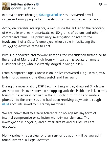 ਸੰਗਰੂਰ ਪੁਲਿਸ ਨੇ ਜੇਲ੍ਹ ਅੰਦਰੋਂ ਚੱਲ ਰਹੇ ਨਸ਼ਾ ਤਸਕਰੀ ਦੇ ਰੈਕੇਟ ਦਾ ਕੀਤਾ ਪਰਦਾਫਾਸ਼, ਪਾਬੰਦੀਸ਼ੁਦਾ ਸਾਮਾਨ ਸਣੇ 2 ਕਾਬੂ