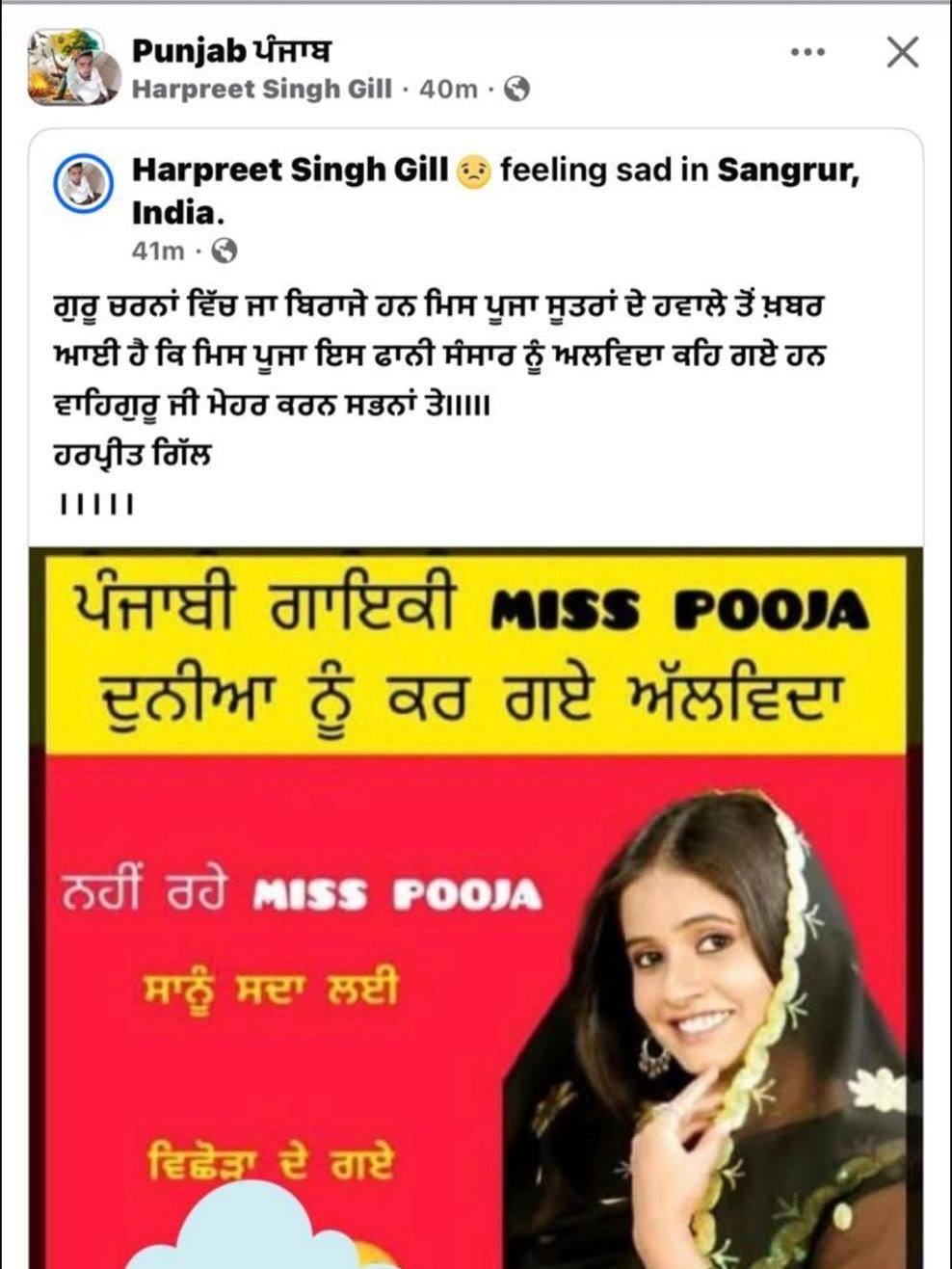 ਦੱਸ ਦੇਈਏ ਕਿ ਵਾਇਰਲ ਹੋਈ ਪੋਸਟ ਵਿਚ ਲਿਖਿਆ ਗਿਆ ਹੈ ਕਿ ” ਗੁਰੂ ਚਰਨਾਂ ਵਿੱਚ ਜਾ ਬਿਰਾਜੇ ਮਿਸ ਪੂਜਾ ਸੂਤਰਾਂ ਦੇ ਹਵਾਲੇ ਤੋਂ ਖਬਰ ਆਈ ਹੈ ਕਿ ਮਿਸ ਪੂਜਾ ਇਸ ਫਾਨੀ ਸੰਸਾਰ ਨੂੰ ਅਲਵਿਦਾ ਕਹਿ ਗਏ ਹਨ। ਵਾਹਿਗੁਰੂ ਜੀ ਮੇਹਰ ਕਰਨ ਸਭਨਾਂ ਤੇ। ਇਸੇ ਪੋਸਟ ਦਾ ਜਵਾਬ ਦਿੰਦੇ ਹੋਏ ਮਿਸ ਪੂਜਾ ਨੇ ਲਿਖਿਆ ਕਿ ਇਹ ਖਬਰ ਇਕ ਅਫਵਾਹ ਹੈ। ਉਨ੍ਹਾਂ ਆਪਣੇ ਇੰਸਟਗ੍ਰਾਮ ‘ਤੇ ਪੋਸਟ ਕਰਦਿਆ ਲਿਖਿਆ ”ਟੱਲ ਜੋ-ਟੱਲ ਜੋ ਇੰਨੀ ਛੇਤੀ ਨਹੀਂ ਮਰਦੀ ਮੈਂ, ਹਮ ਅਭੀ ਜ਼ਿੰਦਾ ਹੈ।