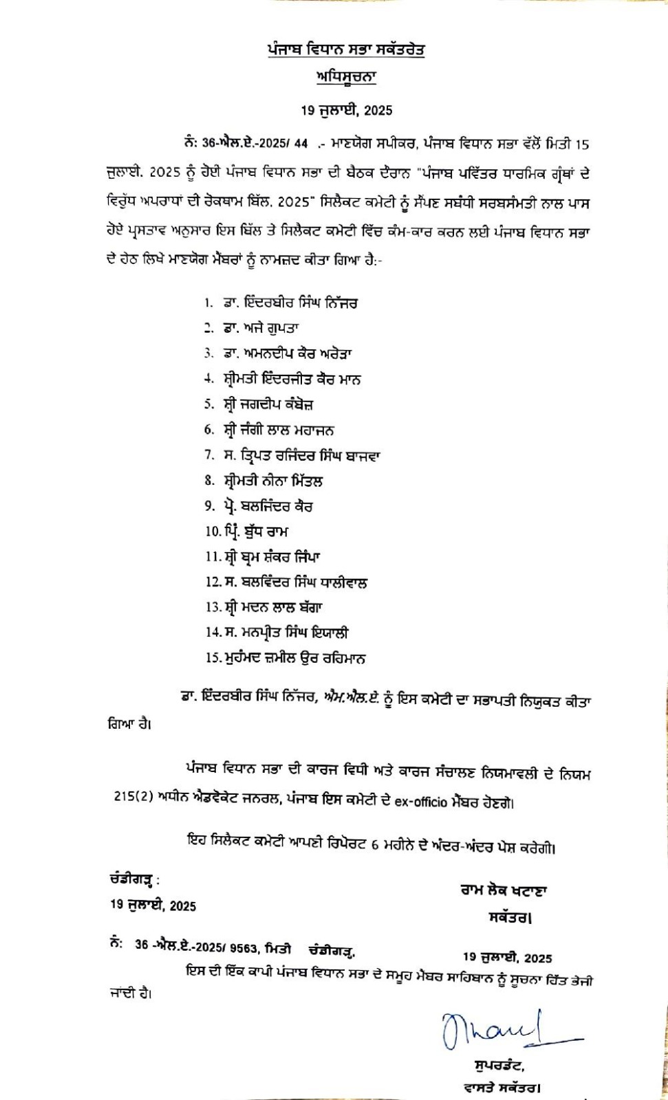 ਮਾਣਯੋਗ ਸਪੀਕਰ ਪੰਜਾਬ ਵਿਧਾਨ ਸਭਾ ਵੱਲੋਂ ਮਿਤੀ 15 ਜੁਲਾਈ, 2025 ਨੂੰ ਹੋਈ ਪੰਜਾਬ ਵਿਧਾਨ ਸਭਾ ਦੀ ਬੈਠਕ ਦੌਰਾਨ “ਪੰਜਾਬ ਪਵਿੱਤਰ ਧਾਰਮਿਕ ਗ੍ਰੰਥਾਂ ਦੇ ਵਿਰੁੱਧ ਅਪਰਾਧਾਂ ਦੀ ਰੋਕਥਾਮ ਬਿੱਲ, 2025” ਸਿਲੈਕਟ ਕਮੇਟੀ ਨੂੰ ਸੌਂਪਣ ਸਬੰਧੀ ਸਰਬਸੰਮਤੀ ਨਾਲ ਪਾਸ ਹੋਏ ਪ੍ਰਸਤਾਵ ਅਨੁਸਾਰ ਇਸ ਬਿੱਲ ਤੇ ਸਿਲੈਕਟ ਕਮੇਟੀ ਵਿੱਚ ਕੰਮਕਾਰ ਕਰਨ ਲਈ ਪੰਜਾਬ ਵਿਧਾਨ ਸਭਾ ਦੇ ਹੇਠ ਲਿਖੇ ਮਾਣਯੋਗ ਮੈਂਬਰਾਂ ਨੂੰ ਨਾਮਜ਼ਦ ਕੀਤਾ ਗਿਆ ਹੈ:-