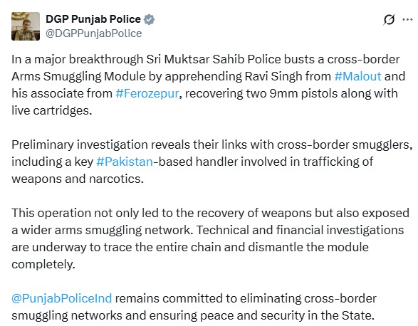 ਡੀਜੀਪੀ ਗੌਰਵ ਯਾਦਵ ਨੇ ਜਾਣਕਾਰੀ ਦਿੰਦੇ ਦੱਸਿਆ ਕਿ ਸ਼ੁਰੂਆਤੀ ਜਾਂਚ ਤੋੰ ਪਤਾ ਲੱਗਾ ਹੈ ਕਿ ਉਸ ਦੇ ਸਰਹੱਦ ਪਾਰ ਤਸਕਰਾਂ ਨਾਲ ਸਬੰਧਤ ਹਨ ਜਿਨ੍ਹਾਂ ਵਿਚ ਹਥਿਆਰਾਂ ਤੇ ਨਸ਼ੀਲੇ ਪਦਾਰਥਾਂ ਦੀ ਤਸਕਰੀ ਵਿਚ ਸ਼ਾਮਲ ਇਕ ਮੁੱਖ ਪਾਕਿਸਤਾਨ ਸਥਿਤ ਹੈਂਡਲਰ ਵੀ ਸ਼ਾਮਲ ਹਨ। ਇਸ ਮੁਹਿੰਮ ਵਿਚ ਨਾ ਸਿਰਫ ਹਥਿਆਰਾਂ ਦੀ ਬਰਾਮਦਗੀ ਹੋਈ ਸਗੋਂ ਹਥਿਆਰਾਂ ਦੀ ਤਸਕਰੀ ਦੇ ਇਕ ਵਿਆਪਕ ਨੈਟਵਰਕ ਦਾ ਵੀ ਪਰਦਾਫਾਸ਼ ਹੋਇਆ।