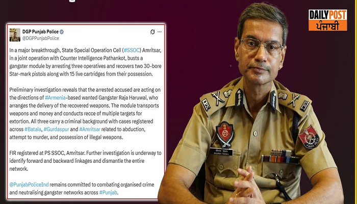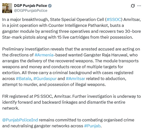 SSOC ਅੰਮ੍ਰਿਤਸਰ ਤੇ ਕਾਊਂਟਰ ਇੰਟੈਲੀਜੈਂਸ ਪਠਾਨਕੋਟ ਨੂੰ ਮਿਲੀ ਸਫਲਤਾ, ਗੈਂਗਸਟਰ ਮਾਡਿਊਲ ਦੇ ਤਿੰਨ ਕਾਰਕੁਨ ਹਥਿਆਰਾਂ ਸਣੇ ਕਾਬੂ