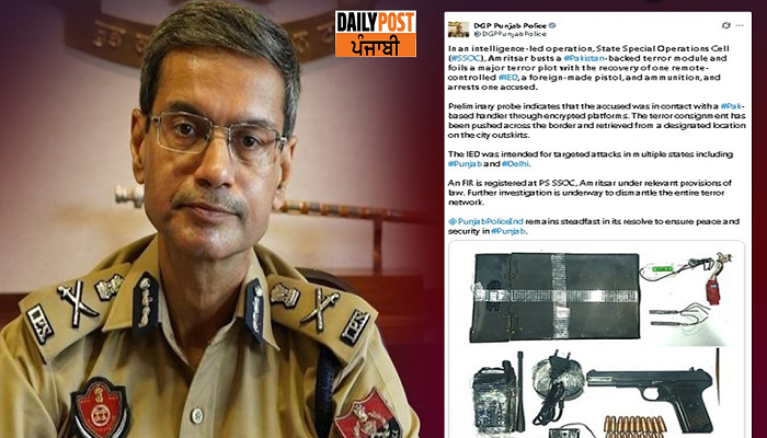 ਅੰਮ੍ਰਿਤਸਰ ਵਿਚ ਸਟੇਟ ਸਪੈਸ਼ਲ ਆਪ੍ਰੇਸ਼ਨਸ ਸੈਲ ਨੇ ਇਕ ਖੁਫੀਆ ਸੂਚਨਾ ਦੇ ਆਧਾਰ ‘ਤੇ ਕਾਰਵਾਈ ਕਰਦੇ ਹੋਏ ਪਾਕਿਸਤਾਨ ਸਮਰਥਿਤ ਇਕ ਅੱਤਵਾਦੀ ਮਾਡਿਊਲ ਦਾ ਪਰਦਾਫਾਸ਼ ਕੀਤਾ ਹੈ। ਇਸ ਮੁਹਿੰਮ ਵਿਚ ਪੁਲਿਸ ਨੇ ਵੱਡੀ ਅੱਤਵਾਦੀ ਸਾਜਿਸ਼ ਨੂੰ ਅਸਫਲ ਕਰਦੇ ਹੋਏ ਇਕ ਮੁਲਜ਼ਮ ਨੂੰ ਗ੍ਰਿਫਤਾਰ ਕੀਤਾ ਹੈ।