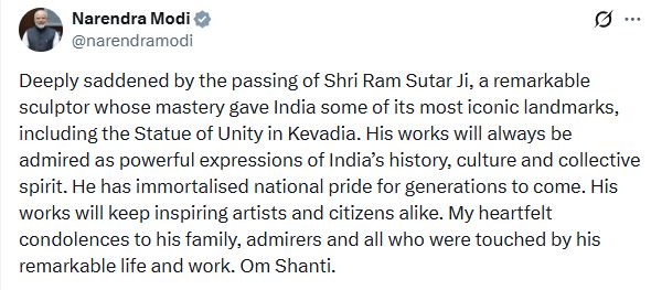ਪ੍ਰਧਾਨ ਮੰਤਰੀ ਨਰਿੰਦਰ ਮੋਦੀ ਨੇ ਆਪਣੇ ਐਕਸ ਅਕਾਊਂਟ (ਪਹਿਲਾ ਟਵੀਟਰ) ‘ਤੇ ਲਿਖਿਆ ਕਿ ਸ਼੍ਰੀ ਰਾਮ ਸੁਤਾਰ ਜੀ ਦੇ ਦਿਹਾਂਤ ‘ਤੇ ਬਹੁਤ ਦੁੱਖ ਹੋਇਆ, ਇੱਕ ਸ਼ਾਨਦਾਰ ਮੂਰਤੀਕਾਰ ਜਿਨ੍ਹਾਂ ਦੀ ਮੁਹਾਰਤ ਨੇ ਭਾਰਤ ਨੂੰ ਇਸਦੇ ਕੁਝ ਸਭ ਤੋਂ ਪ੍ਰਤੀਕ ਸਥਾਨ ਦਿੱਤੇ, ਜਿਸ ਵਿੱਚ ਕੇਵੜੀਆ ਵਿੱਚ ਸਟੈਚੂ ਆਫ਼ ਯੂਨਿਟੀ ਵੀ ਸ਼ਾਮਲ ਹੈ। ਉਨ੍ਹਾਂ ਦੀਆਂ ਰਚਨਾਵਾਂ ਨੂੰ ਹਮੇਸ਼ਾ ਭਾਰਤ ਦੇ ਇਤਿਹਾਸ, ਸੱਭਿਆਚਾਰ ਅਤੇ ਸਮੂਹਿਕ ਭਾਵਨਾ ਦੇ ਸ਼ਕਤੀਸ਼ਾਲੀ ਪ੍ਰਗਟਾਵੇ ਵਜੋਂ ਪ੍ਰਸ਼ੰਸਾ ਕੀਤੀ ਜਾਵੇਗੀ। ਉਨ੍ਹਾਂ ਨੇ ਆਉਣ ਵਾਲੀਆਂ ਪੀੜ੍ਹੀਆਂ ਲਈ ਰਾਸ਼ਟਰੀ ਮਾਣ ਨੂੰ ਅਮਰ ਕਰ ਦਿੱਤਾ ਹੈ। ਉਨ੍ਹਾਂ ਦੀਆਂ ਰਚਨਾਵਾਂ ਕਲਾਕਾਰਾਂ ਅਤੇ ਨਾਗਰਿਕਾਂ ਨੂੰ ਇੱਕੋ ਜਿਹੇ ਪ੍ਰੇਰਿਤ ਕਰਦੀਆਂ ਰਹਿਣਗੀਆਂ। ਉਨ੍ਹਾਂ ਦੇ ਪਰਿਵਾਰ, ਪ੍ਰਸ਼ੰਸਕਾਂ ਅਤੇ ਉਨ੍ਹਾਂ ਸਾਰਿਆਂ ਪ੍ਰਤੀ ਮੇਰੀਆਂ ਦਿਲੋਂ ਸੰਵੇਦਨਾਵਾਂ ਜੋ ਉਨ੍ਹਾਂ ਦੇ ਸ਼ਾਨਦਾਰ ਜੀਵਨ ਅਤੇ ਕੰਮ ਤੋਂ ਪ੍ਰਭਾਵਿਤ ਹੋਏ ਸਨ। ਓਮ ਸ਼ਾਂਤੀ।