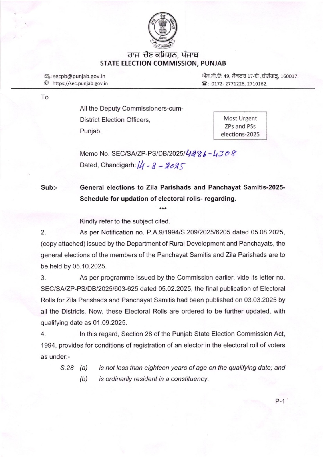 ਹਾਲਾਂਕਿ ਵੋਟਰ ਸੂਚੀਆਂ ਜੋ ਕਿ ਪਹਿਲਾਂ 3 ਮਾਰਚ 2025 ਨੂੰ ਪ੍ਰਕਾਸ਼ਿਤ ਹੋਈਆਂ ਸਨ, ਹੁਣ ਮਿਤੀ ਵਿਚ ਅਪਡੇਟ ਕੀਤੀ ਜਾਵੇਗੀ ਤਾਂ ਜੋ ਯਕੀਨੀ ਬਣਾਇਆ ਜਾ ਸਕੇ ਸਾਰੇ ਯੋਗ ਵੋਟਰ ਸ਼ਾਮਲ ਹਨ। ਵੋਟਰ ਸੂਚੀਆਂ ਅਪਡੇਟ ਕਰਨ ਦੀ ਪ੍ਰਕਿਰਿਆ ਸ਼ੁਰੂ ਹੋ ਗਈ ਹੈ। ਪੰਜਾਬ ਰਾਜ ਚੋਣ ਕਮਿਸ਼ਨ ਐਕਟ 1994 ਦੀ ਧਾਰਾ 28 ਮੁਤਾਬਕ ਯੋਗ ਵੋਟਰਾਂ ਦੀ ਯੋਗਤਾ ਦੀ ਉਮਰ 18 ਸਾਲ ਹੋਣੀ ਚਾਹੀਦੀ ਹੈ। ਵੋਟਰ ਆਮ ਤੌਰ ‘ਤੇ ਹਲਕੇ ਦਾ ਨਿਵਾਸੀ ਹੋਣਾ ਚਾਹੀਦਾ ਹੈ। ਚੋਣ ਕਮਿਸ਼ਨ ਨੇ ਕਿਹਾ ਕਿ ਮੌਜੂਦਾ ਵੋਟਰ ਸੂਚੀਆਂ ਦਾ ਖਰੜਾ 19 ਅਗਸਤ ਨੂੰ ਪ੍ਰਕਾਸ਼ਨ ਕੀਤਾ ਜਾਵੇਗਾ ਤੇ ਲੋਕ 20 ਅਗਸਤ ਤੋਂ 27 ਅਗਸਤ 2025 ਤੱਕ ਦਾਅਵੇ ਤੇ ਇਤਰਾਜ਼ ਜ਼ਾਹਿਰ ਕਰ ਸਕਦੇ ਹਨ। ਇਨ੍ਹਾਂ ਦਾ ਨਿਪਟਾਰਾ 1 ਸਤੰਬਰ 2025 ਤੱਕ ਕੀਤਾ ਜਾਵੇਗਾ।