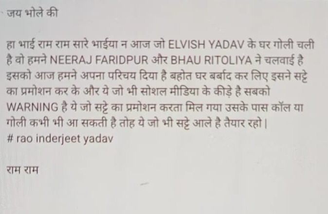 ਰਿਪੋਰਟਾਂ ਅਨੁਸਾਰ, ਨਾਮੀ ਗੈਂਗ ਨੇ ਇਸ ਗੋਲੀਬਾਰੀ ਦੀ ਜ਼ਿੰਮੇਵਾਰੀ ਲਈ ਹੈ। ਮੰਨਿਆ ਜਾ ਰਿਹਾ ਹੈ ਕਿ ਇਹ ਹਮਲਾ ਚੇਤਾਵਨੀ ਵਜੋਂ ਕੀਤਾ ਗਿਆ ਹੈ। ਹਾਲਾਂਕਿ, ਹੁਣ ਤੱਕ ਕਿਸੇ ਵੀ ਦੋਸ਼ੀ ਦੀ ਪਛਾਣ ਨਹੀਂ ਹੋ ਸਕੀ ਹੈ। ਇਸ ਦੇ ਨਾਲ ਹੀ, ਐਲਵਿਸ਼ ਯਾਦਵ ਦੇ ਪਿਤਾ ਨੇ ਦੱਸਿਆ ਕਿ ਇਸ ਘਟਨਾ ਕਾਰਨ ਪਰਿਵਾਰ ਘਬਰਾਹਟ ਵਿੱਚ ਹੈ। ਉਨ੍ਹਾਂ ਕਿਹਾ ਕਿ ਉਨ੍ਹਾਂ ਨੂੰ ਪਹਿਲਾਂ ਕਦੇ ਕਿਸੇ ਕਿਸਮ ਦੀ ਧਮਕੀ ਨਹੀਂ ਮਿਲੀ ਸੀ। ਇਸ ਦੇ ਨਾਲ ਹੀ, ਪੁਲਿਸ ਦਾ ਕਹਿਣਾ ਹੈ ਕਿ ਐਲਵਿਸ਼ ਵੱਲੋਂ ਅਜੇ ਤੱਕ ਕੋਈ ਅਧਿਕਾਰਤ ਸ਼ਿਕਾਇਤ ਦਰਜ ਨਹੀਂ ਕਰਵਾਈ ਗਈ ਹੈ। ਇਸ ਦੇ ਬਾਵਜੂਦ, ਪੁਲਿਸ ਨੇ ਫੋਰੈਂਸਿਕ ਟੀਮ ਨੂੰ ਬੁਲਾਇਆ ਹੈ ਅਤੇ ਗੋਲੀਆਂ ਦੇ ਨਿਸ਼ਾਨ ਅਤੇ ਹੋਰ ਸਬੂਤ ਇਕੱਠੇ ਕੀਤੇ ਹਨ। ਨਾਲ ਹੀ, ਆਸ ਪਾਸ ਦੇ ਸਾਰੇ ਸੀਸੀਟੀਵੀ ਫੁਟੇਜ ਨੂੰ ਸਕੈਨ ਕੀਤਾ ਜਾ ਰਿਹਾ ਹੈ।