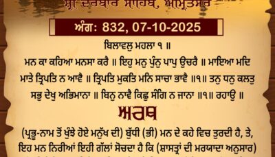 ਸ੍ਰੀ ਦਰਬਾਰ ਸਾਹਿਬ ਤੋਂ ਅੱਜ ਦਾ ਹੁਕਮਨਾਮਾ 7-10-2025