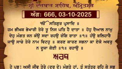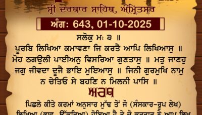 ਸ੍ਰੀ ਦਰਬਾਰ ਸਾਹਿਬ ਤੋਂ ਅੱਜ ਦਾ ਹੁਕਮਨਾਮਾ 1-10-2025