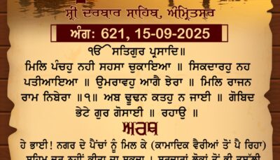 ਸ੍ਰੀ ਦਰਬਾਰ ਸਾਹਿਬ ਤੋਂ ਅੱਜ ਦਾ ਹੁਕਮਨਾਮਾ 15-9-2025