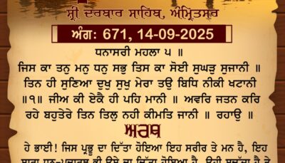 ਸ੍ਰੀ ਦਰਬਾਰ ਸਾਹਿਬ ਤੋਂ ਅੱਜ ਦਾ ਹੁਕਮਨਾਮਾ 14-9-2025