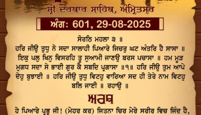 ਸ੍ਰੀ ਦਰਬਾਰ ਸਾਹਿਬ ਤੋਂ ਅੱਜ ਦਾ ਹੁਕਮਨਾਮਾ 29-8-2025